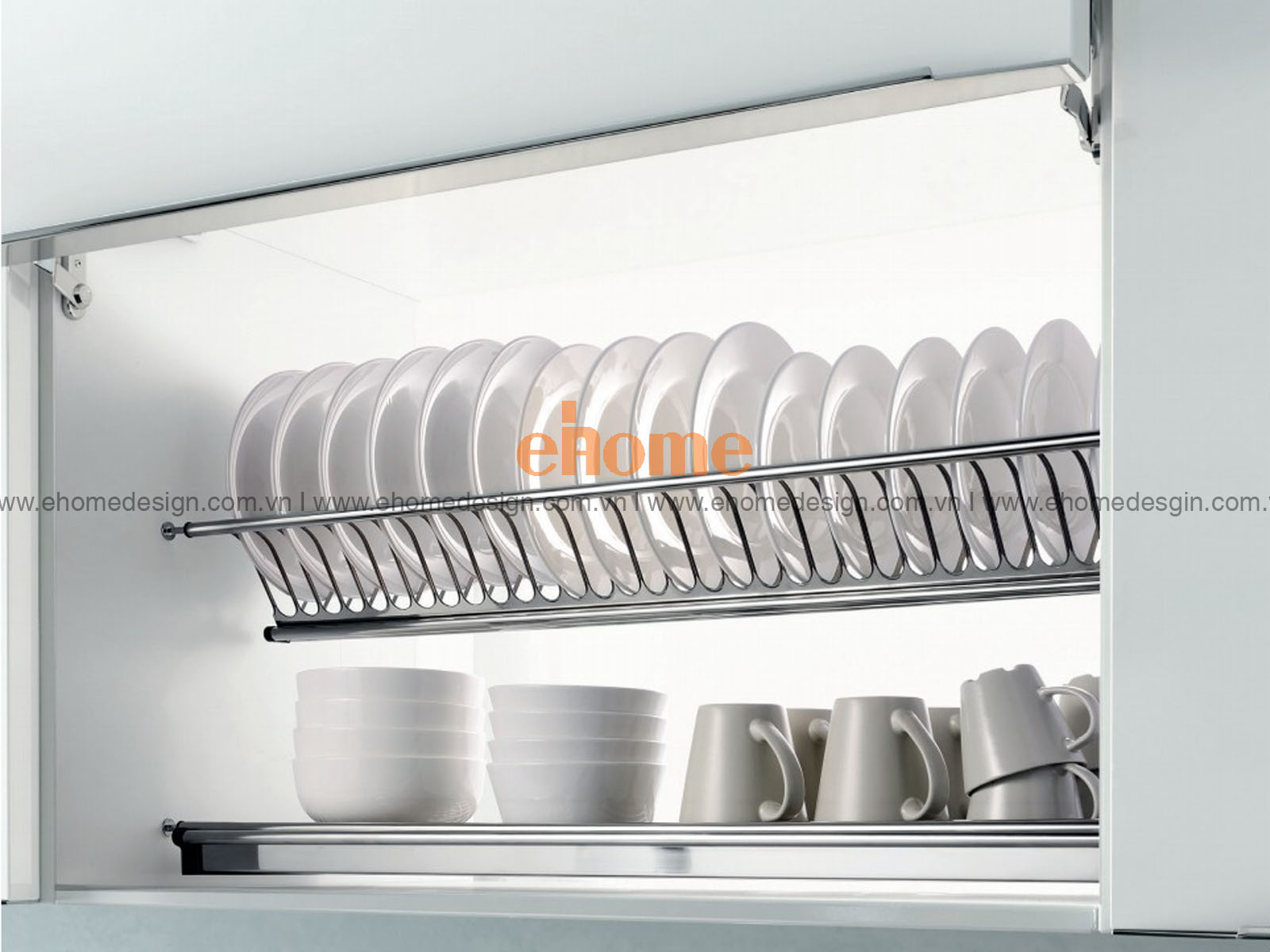 Với tủ bếp trên, nên chọn giá bát đĩa inox 304 có khay hứng nước, tránh gỉ sét và dễ vệ sinh.