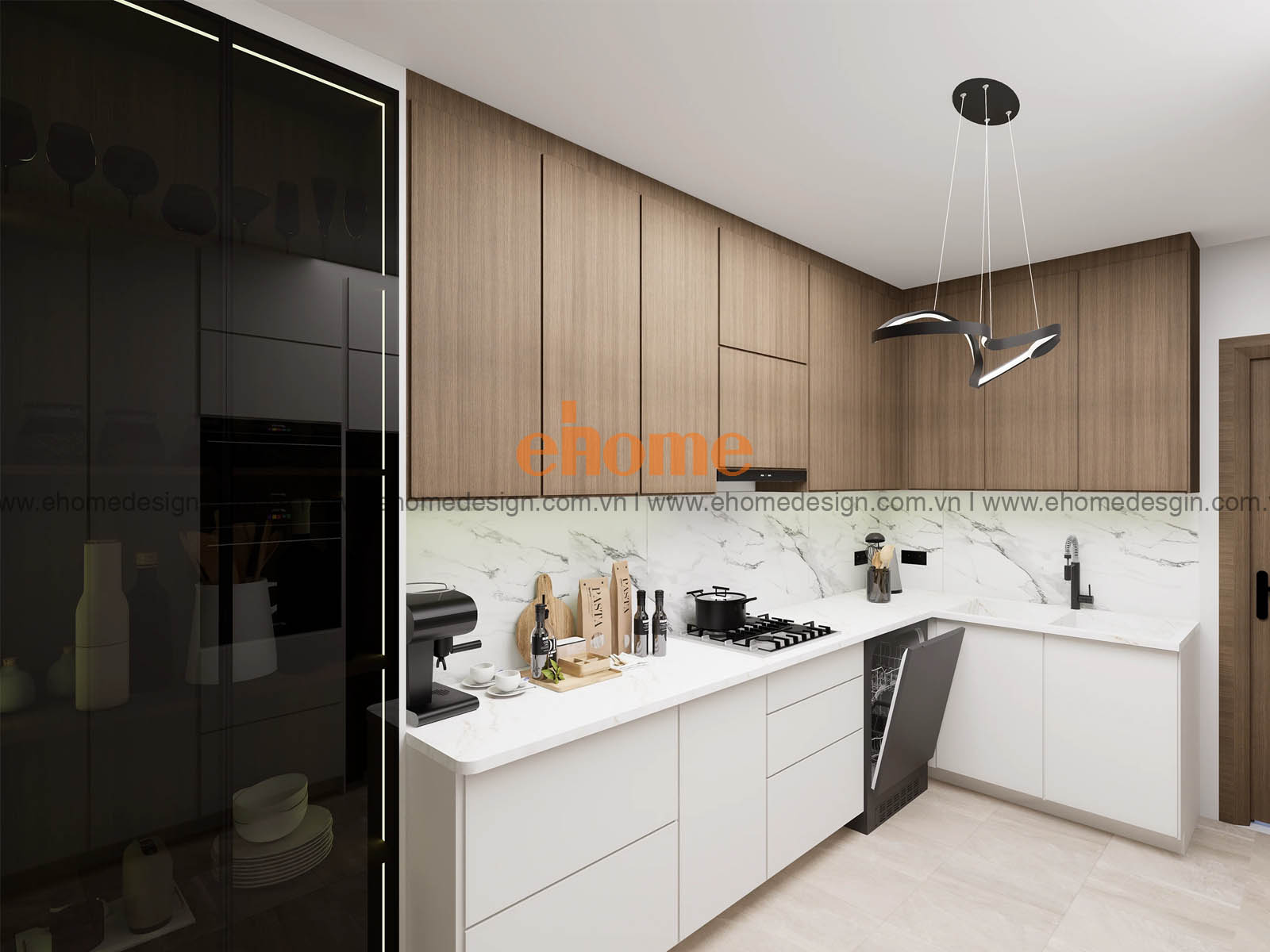 - Phong cách hiện đại: Dùng inox sáng bóng, ray âm, giá kính hoặc mặt nhôm.